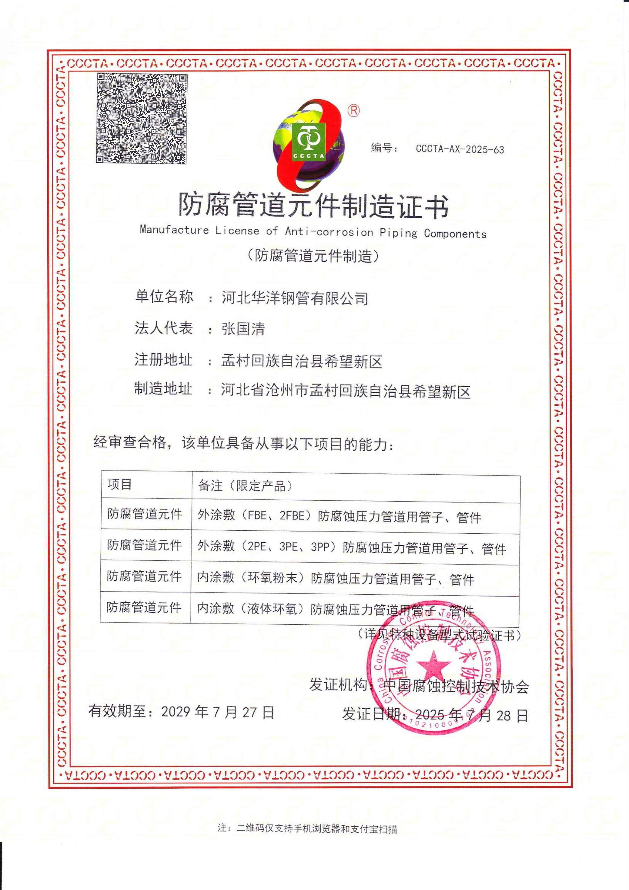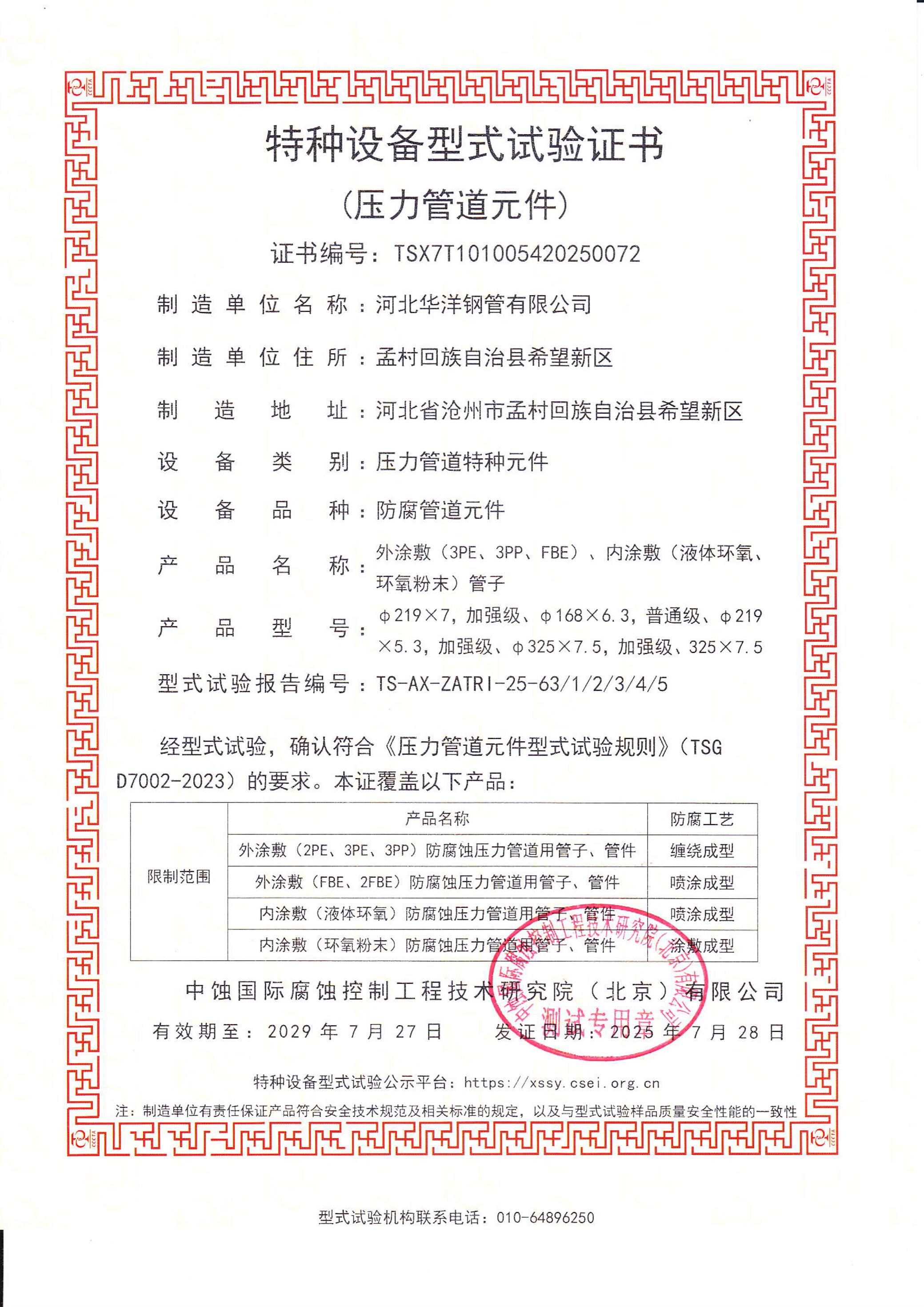 防腐管道元件制造證書