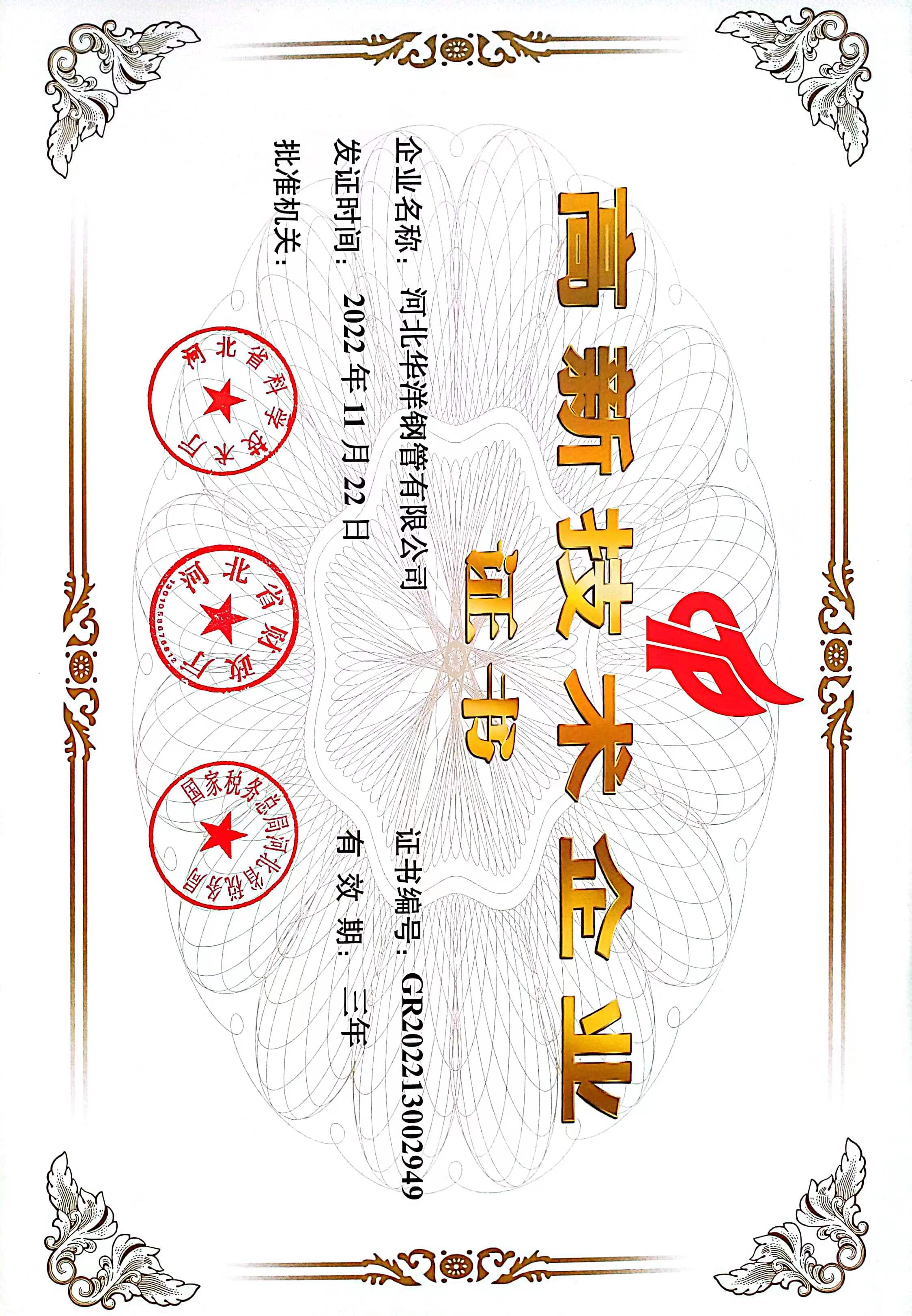 高新技術企業(yè)證書