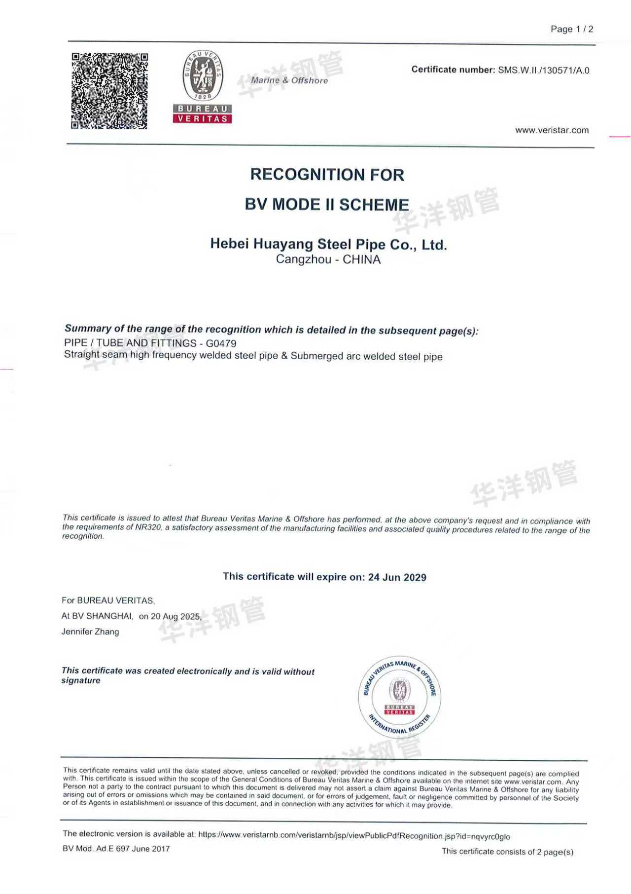 華洋鋼管順利通過法國船級(jí)社(BV)工廠認(rèn)證